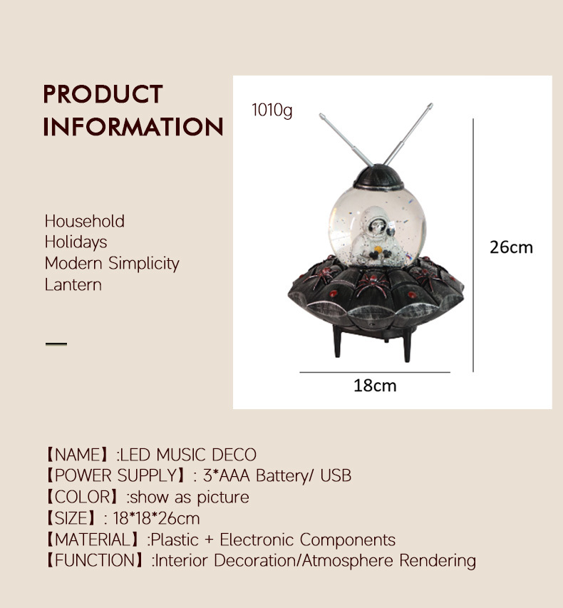 1: Used for decoration, placed on the table, the internal liquid is driven by the rotation of the motor, the whole flow up, combined with the internal pattern and the drift of the gold powder inside, increase the festive atmosphere and atmosphere at the same time play a lighting role. 2: Power supply: Support USB device power supply and 3*AAA battery power supply. 3: Product materials: plastic, LED lights, mixed liquid, motor, PCB, decorative parts.